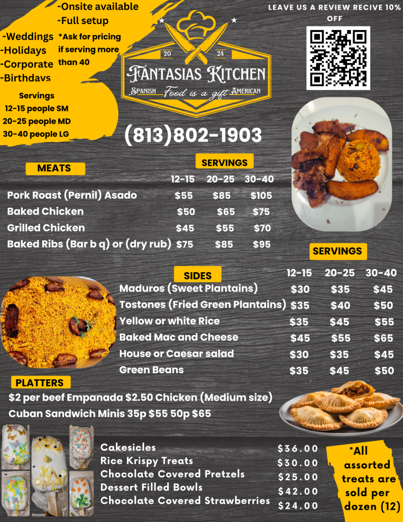 Indulge in our exceptional Spanish-American culinary creations crafted with treasured family recipes passed down through generations. We promise an extraordinary gastronomic journey that will tantalize your taste buds and leave you yearning for more. At Fantasias Kitchen, we believe that food is a precious gift, and we are privileged to share our culinary heritage with you. Join us for a dining experience that celebrates tradition, flavor, and the joy of good food.
